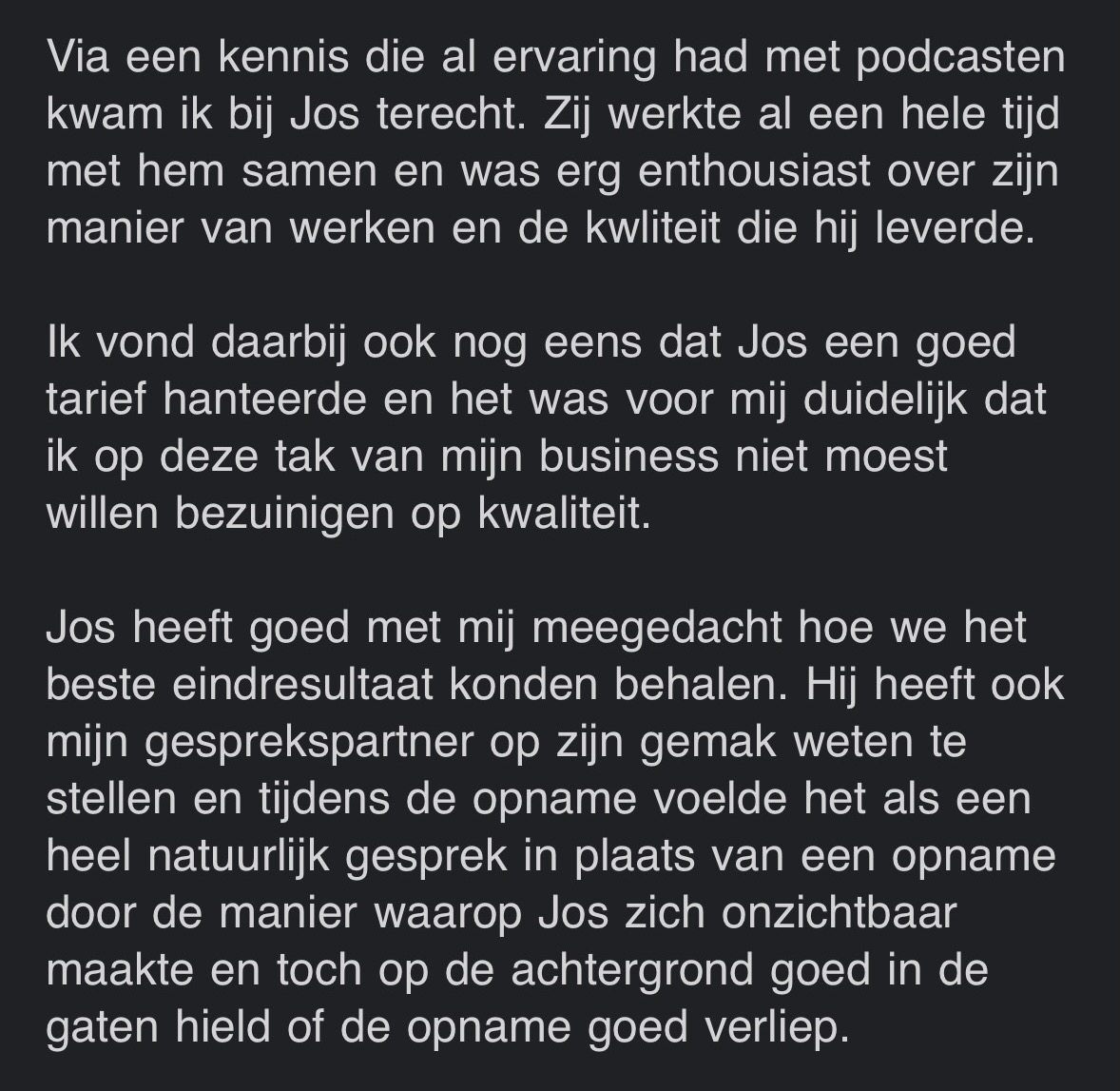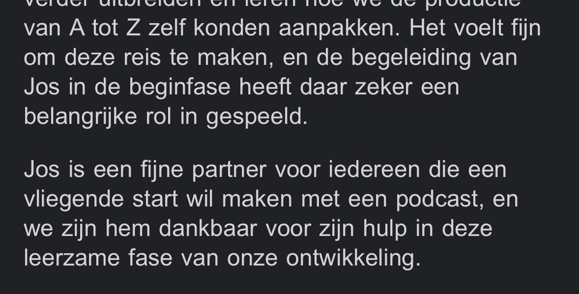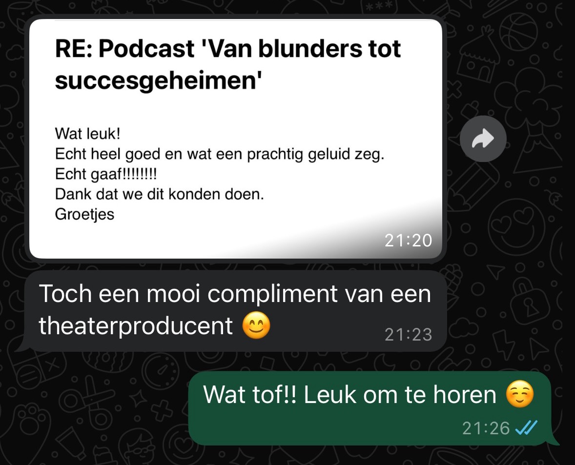 “Erg tevreden met mijn professioneel klinkende podcast! Ik merk dat ik als business coach nog serieuzer genomen word.”